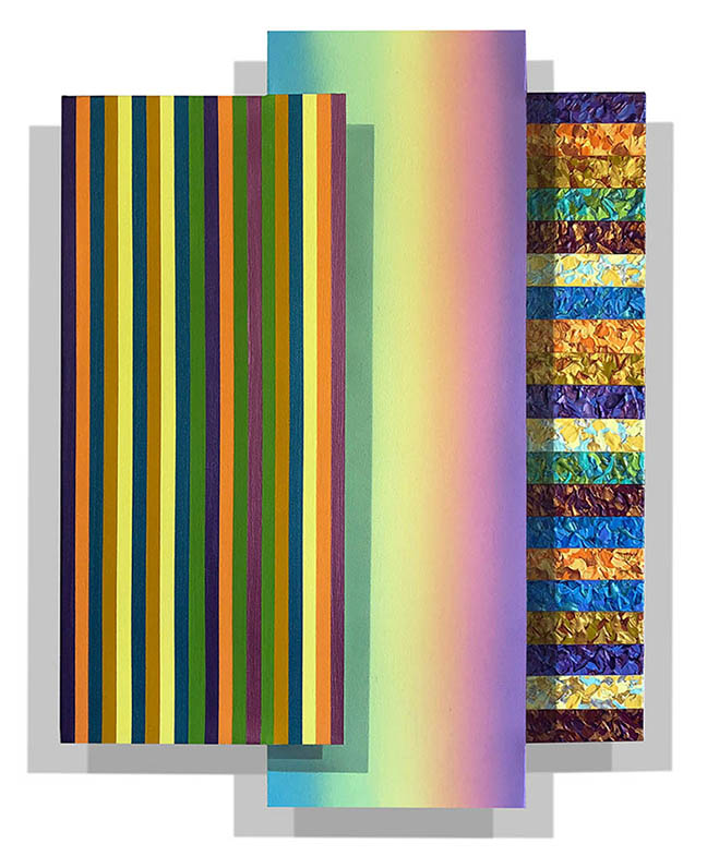 | The “Trilogy ” series: Geometric, shaped-canvas paintings incorporate an illusionistic, three-panel format that justapose contrasting abstract genres and application methods. High-key color systems consisting of harde edge, color field, and expressive brushwork result in a trilogy of visual and conceptual approaches to contenporary abstract painting (2019-ongoing). | |||||||||